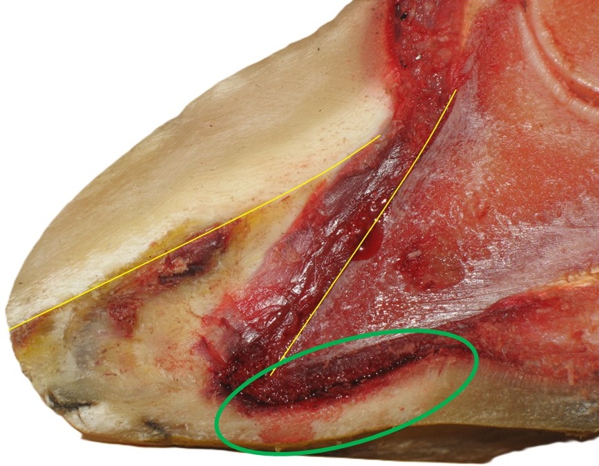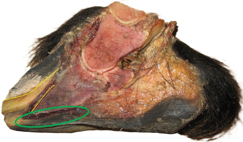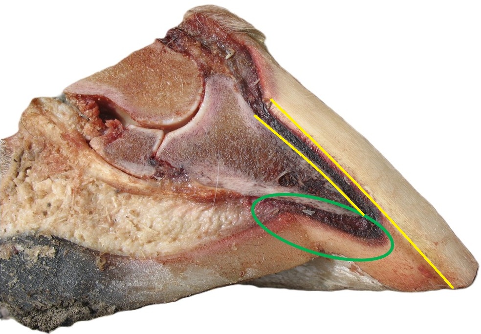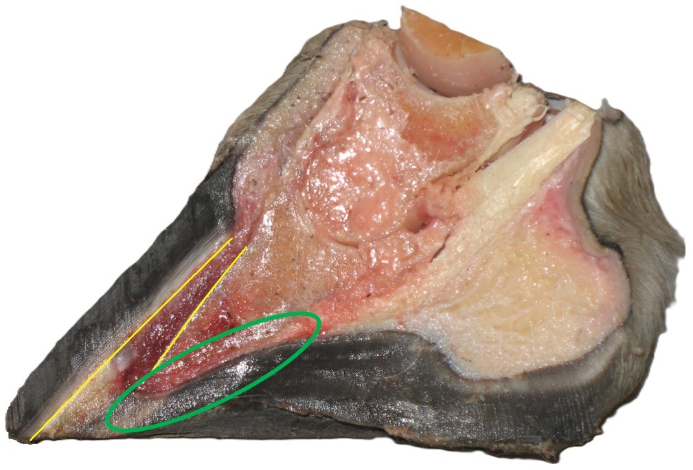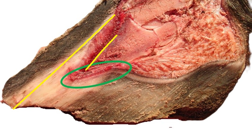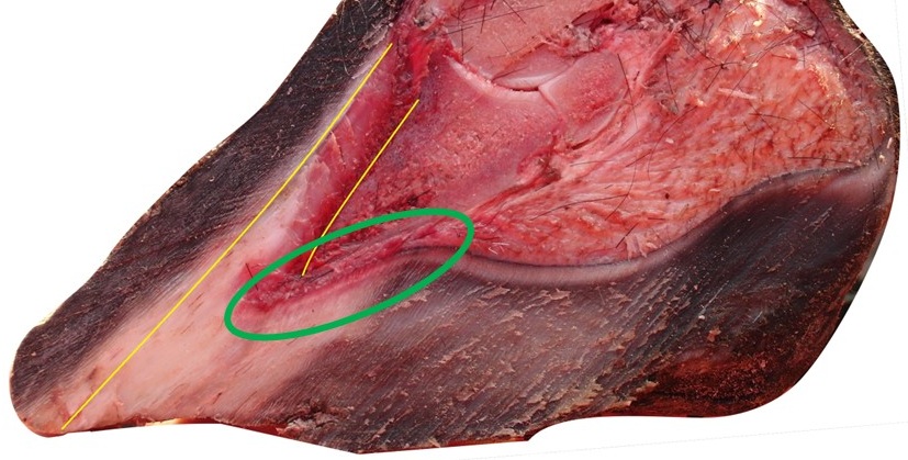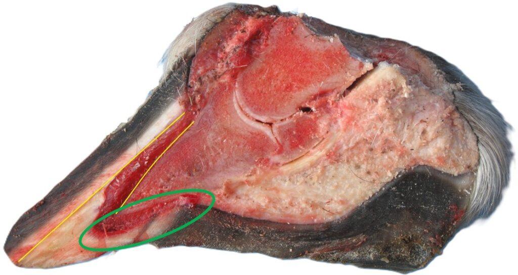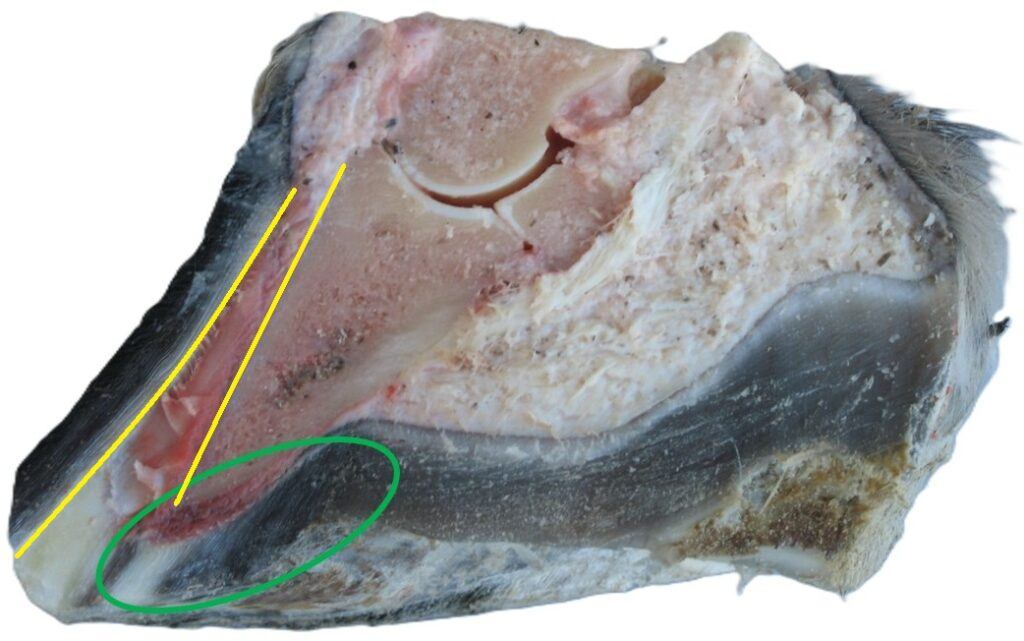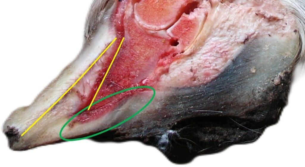 The green ovals below mark the areas that must have been completely crushed if the coffin bones had rotated. Coriums and soles under the tip of the coffin bone would have shown signs of cruch damage, but there are none. The damaged hoof tissue is always above the coffin bone, which is evidence that the coffin bones have never rotated down, even though all but one of the following hooves have the condition “coffin bone rotation”. The one that doesn’t is only there to show you what the tissue looks like in a hoof that doesn’t have the condition.