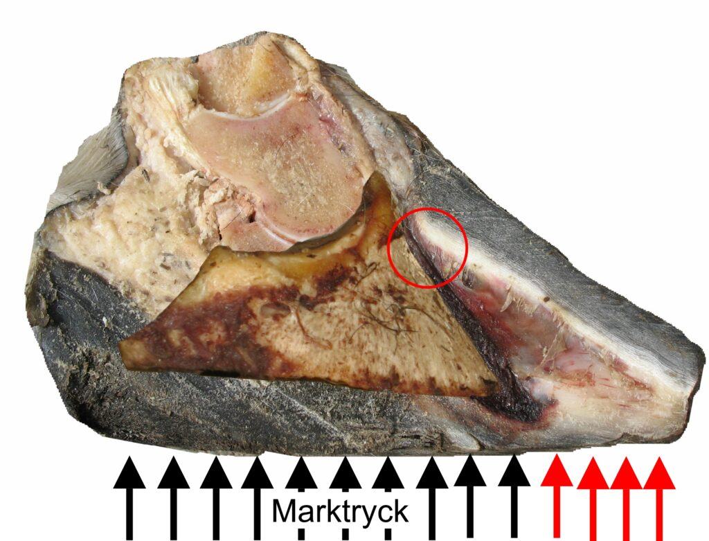 When the hoof sinks into the ground, the pressure is distributed across the entire underside of the hoof, which reduces the load per unit area. Note that the pressure from the coffin bone goes straight down, and if the hoof is larger than the coffin bone, the oversized part of the hoof will be pushed upward by the ground pressure (Red arrows), while the part directly under the coffin bone will be in balance when it comes to forces since the coffin bone will press down with the force create by the horse’s weight and ground pressure (black arrows) will be pushing up with the same force. This means that the outer part of the sole and the white line will be subjected to tensile forces upwards from ground pressure bending and stretching the sole since there is no weight pressing down.