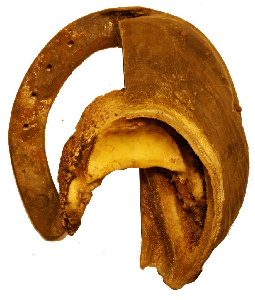 The same applies if the hoof is shod and the hoof wall extends below the sole level, thus bearing weight. When the hoof wall is pushed upward relative to the coffin bone and the part of the sole beneath the coffin bone, unnatural forces will cause stretching of the hoof wall’s attachment (laminea) to the hoof capsule. A healthy hoof can withstand quite a lot of such forces compared to a hoof that has been affected by laminitis.