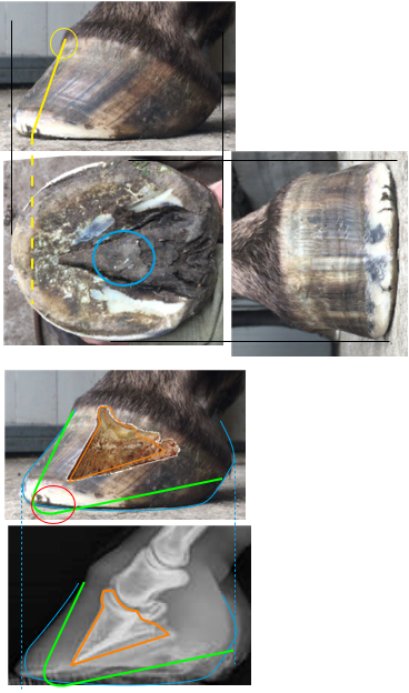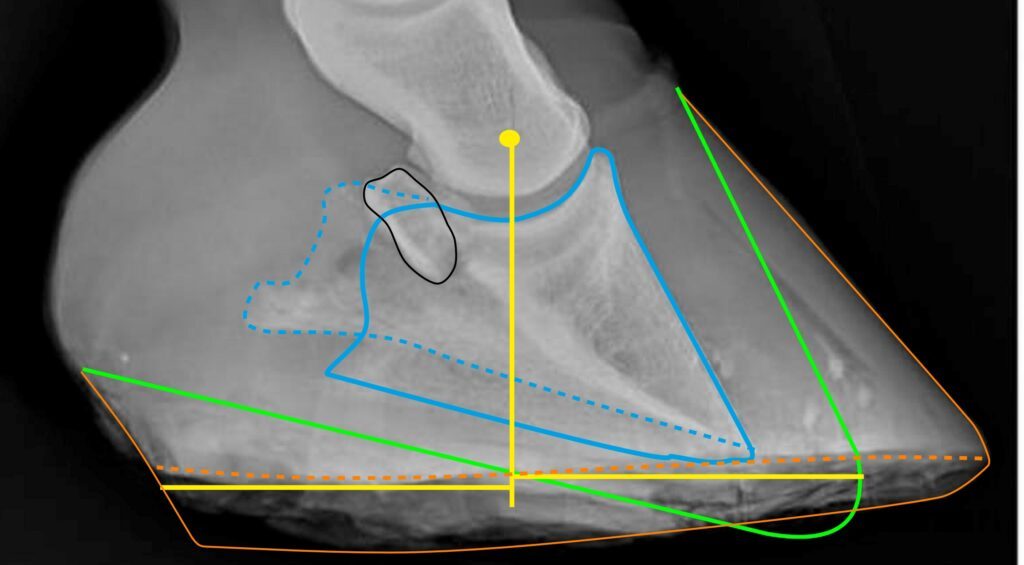- Yellow dot = the point from where the horse’s weight loads the coffin bone
